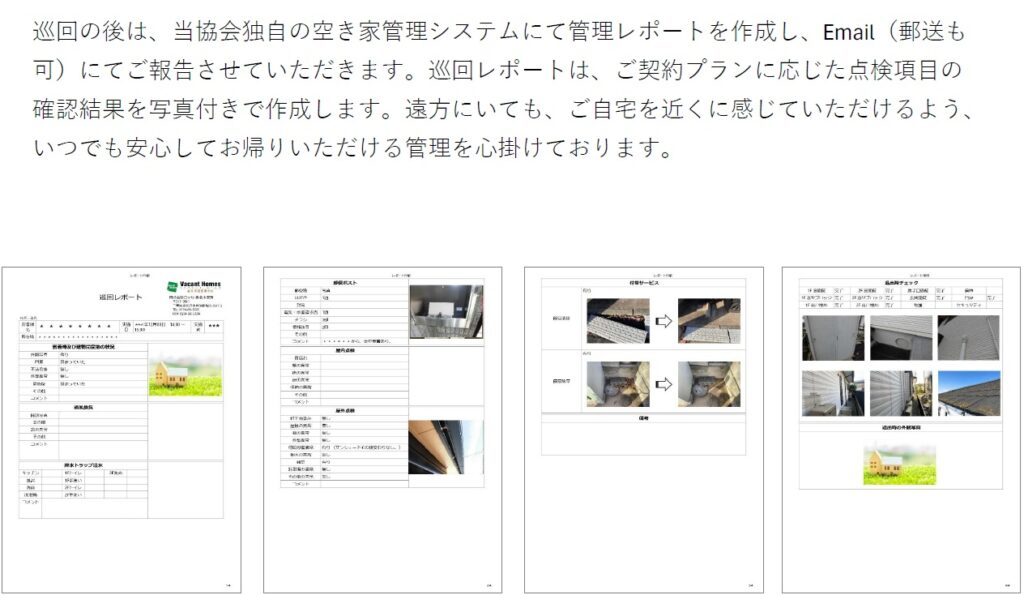 管理状況は、写真付きの管理報告書をEメールまたは郵送にてご報告することで、お客様に安心をお届けします。
